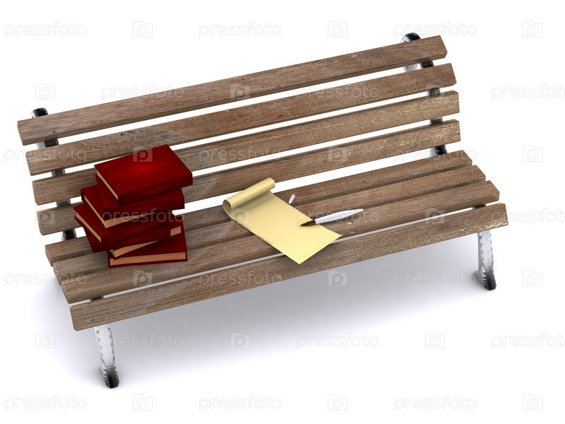 Бумага, перо и стопка книг, лежащие на скамейке