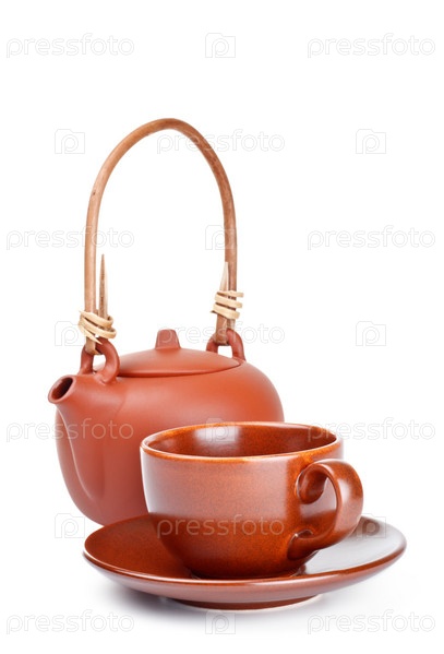 Керамический чайник и чашка с блюдцем на белом фоне