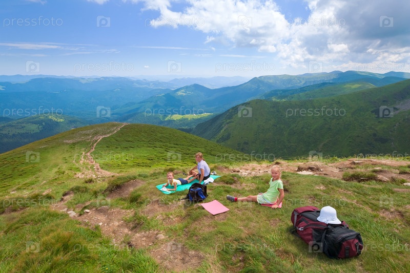 Семья отдыхает на вершине горы (гора Говерла, Украина)