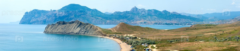 Скалистое побережье и кемпинг на песчаном пляже (Тихая гавань, Коктебель, Крым, Украина)