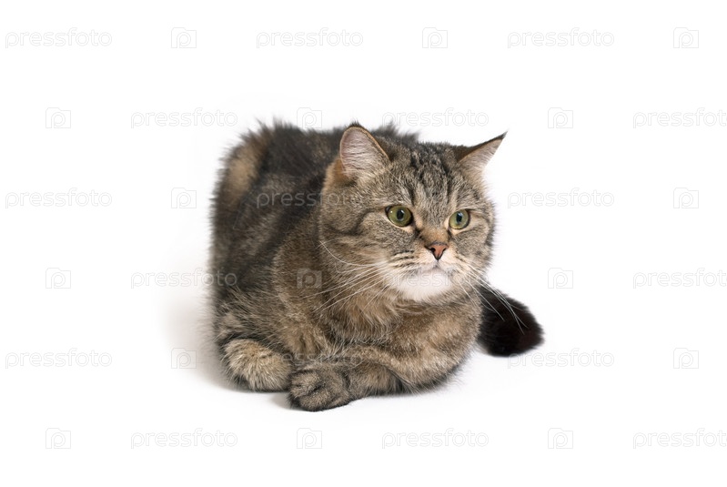 Серая пушистая кошка лежит на белом фоне