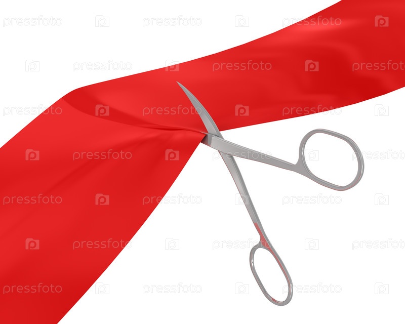 Ножницы и красная лента на белом фоне