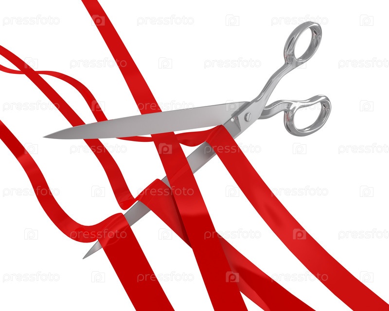 Ножницы и красные ленты на белом фоне