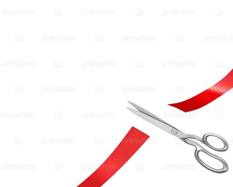 Ножницы, разрезавшие красную ленту, на белом фоне