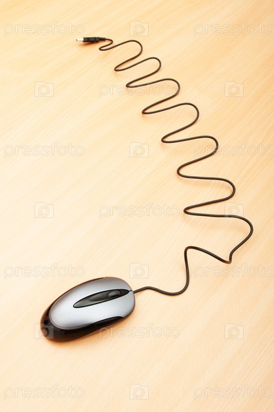 Компьютерная мышь с проводом на деревянном столе