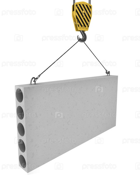 Кран поднимает бетонную плиту, изолирован на белом фоне
