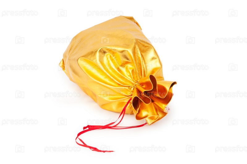 Мешок из золотистой ткани на белом фоне