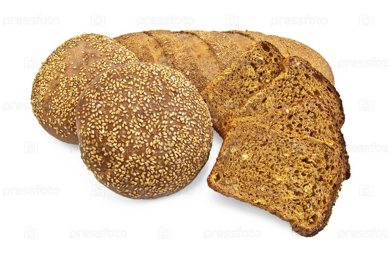 Ржаной хлеб и булочки с кунжутом на белом фоне