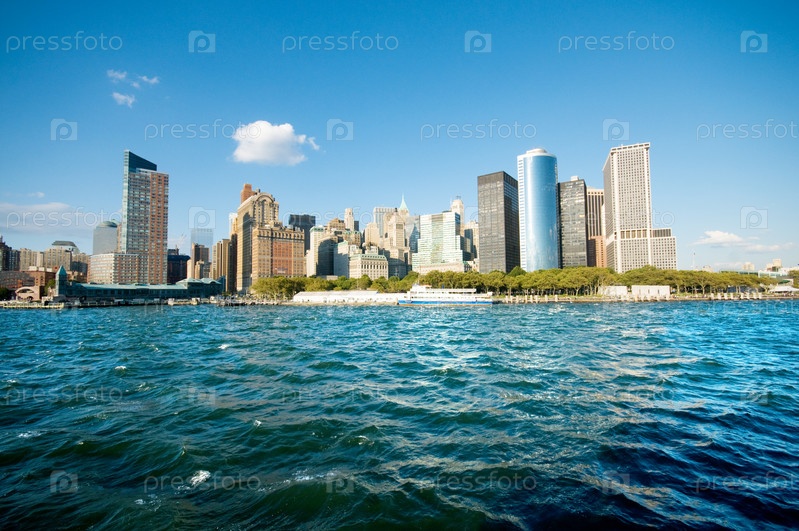 Небоскребы города Нью-Йорка на побережье океана