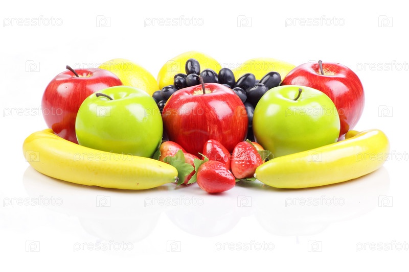 Пластмассовые фрукты, изолированные на белом фоне