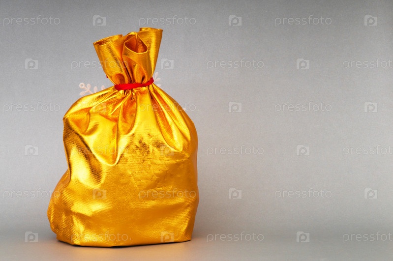Золотой подарочный мешочек на сером фоне