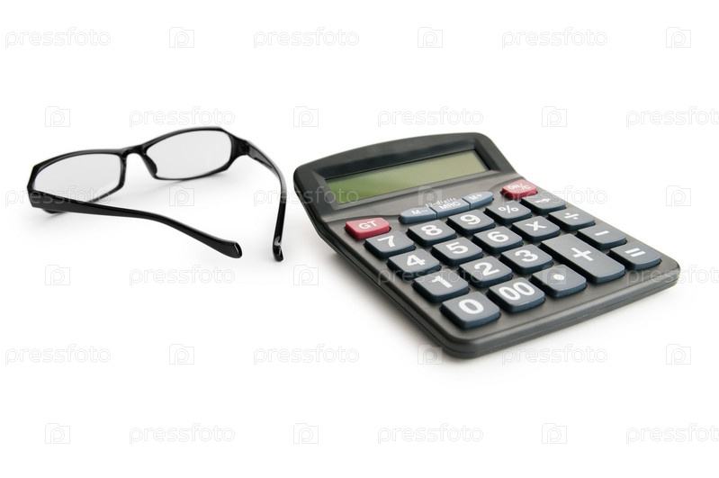 Калькулятор и очки на белом фоне