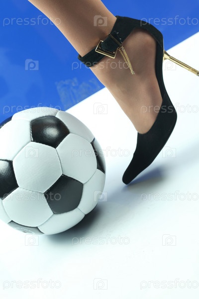 Женская нога, обутая в туфлю, рядом с футбольным мячом