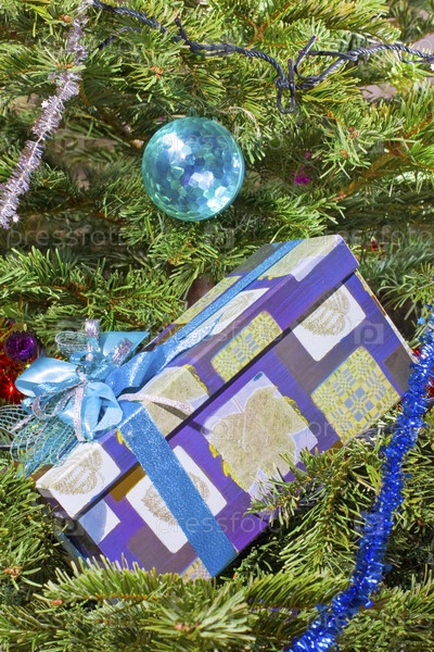 Елка с новогодними украшениями и подарочная коробка крупным планом