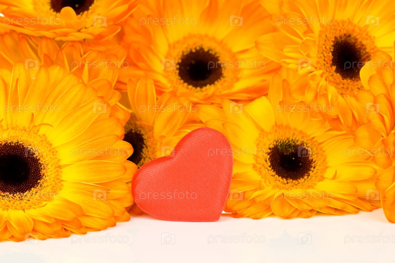 Желтые герберы и сердечко на белом фоне