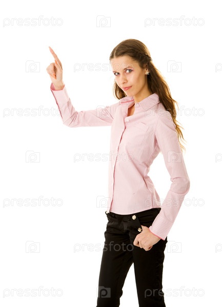 Юная секретарша указывает пальцем на что-то вверху