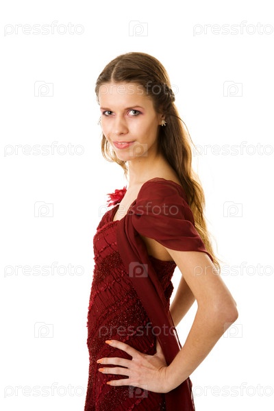 Девушка в красном шелковом платье на белом фоне