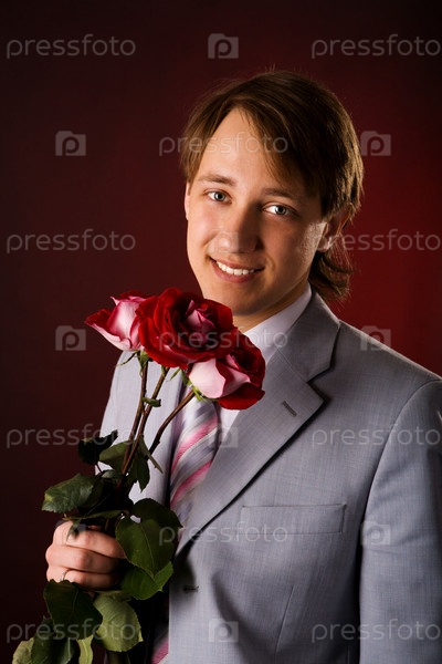 Элегантный молодой человек с букетом красных роз