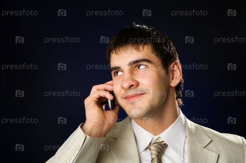 Бизнесмен говорит по сотовому телефону на черном фоне