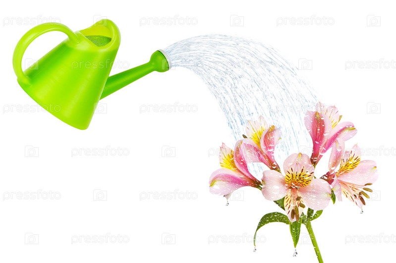 Полив лилий из лейки, белый фон