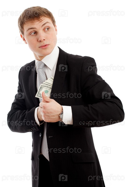 Бизнесмен прячет пачку долларов в карман