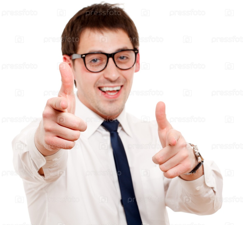 Веселый мужчина указывает пальцами в камеру