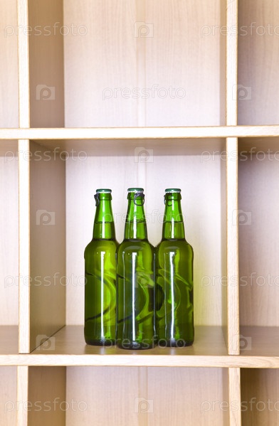 Три зеленых стеклянных бутылки на полке