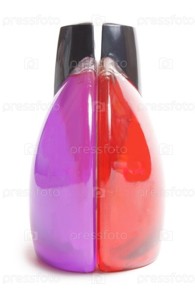 Фиолетовый и красный гель для душа на белом фоне (изолирован)