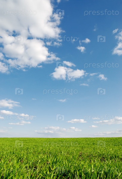 Весеннее зеленое поле под голубым небом