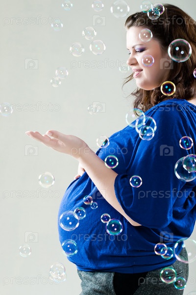 Красивая беременная женщина с мыльными пузырями