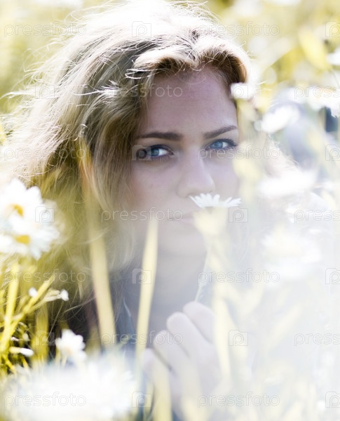 Портрет красивой блондинки с ромашкой