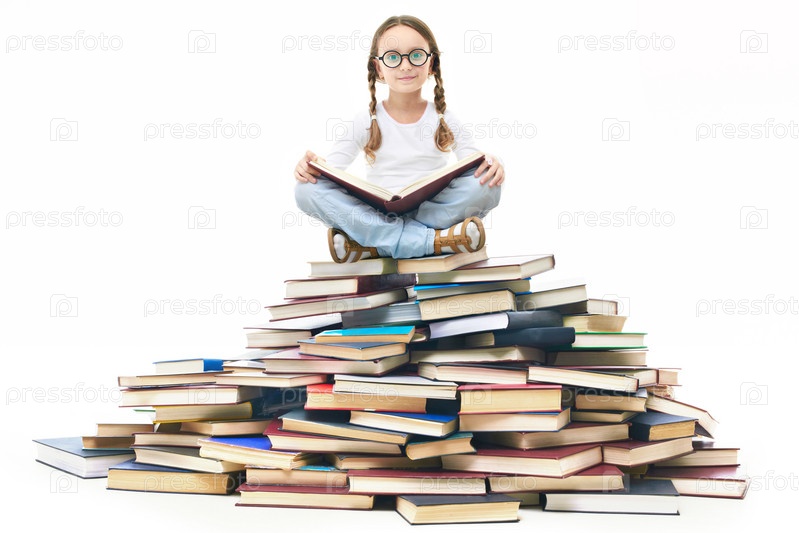 Школьница читает много книг