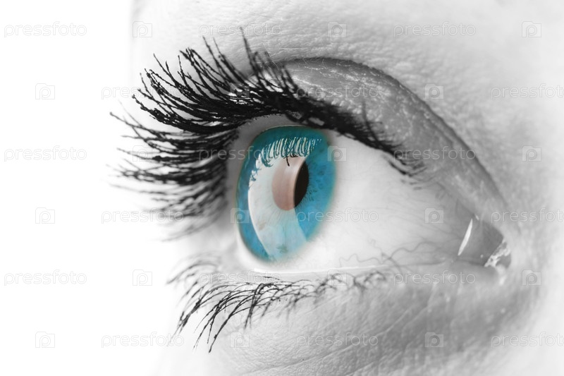Черно-белая фотография женского глаза с голубым зрачком, крупный план