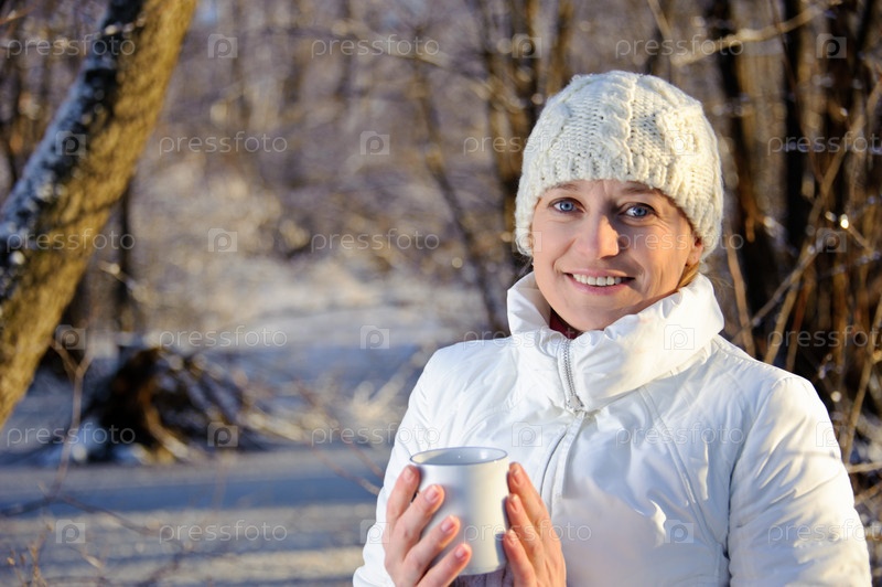Красивая женщина на природе с чашкой в руках