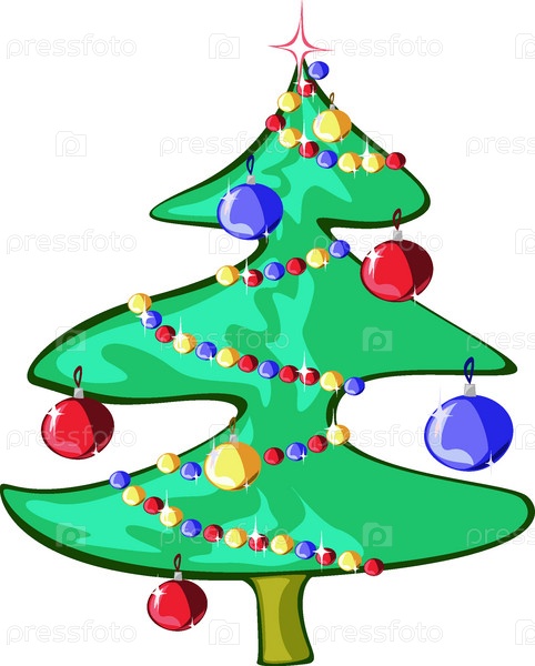 Елка, украшенная игрушками, на белом фоне