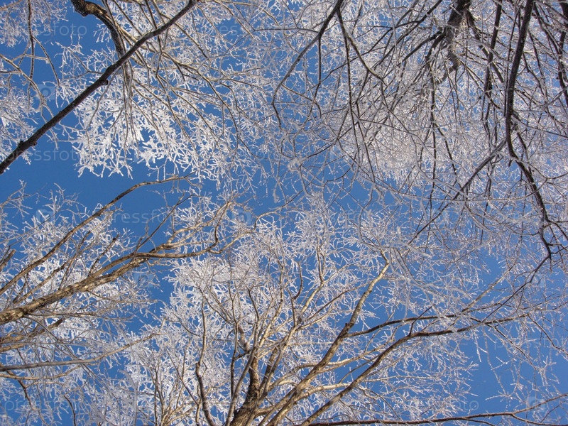 Заснеженные верхушки деревьев на фоне синего неба