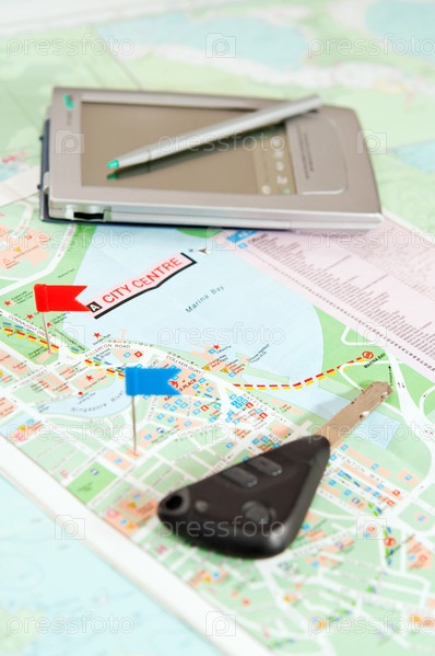 Автомобильная карта с цветными флажками, ключ от машины и электронный органайзер