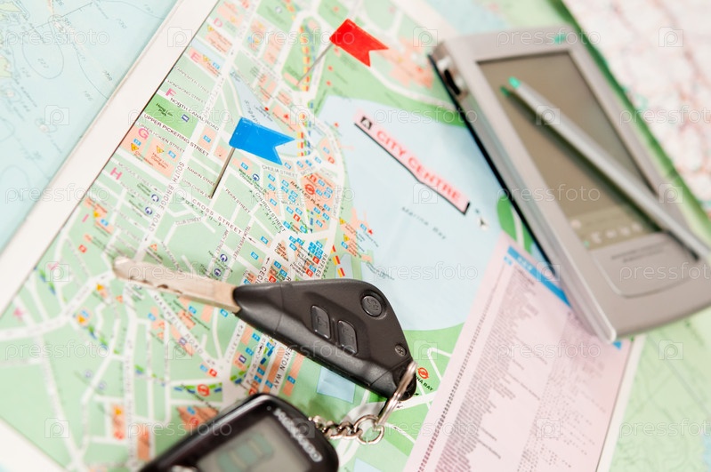 Карта города с цветными флажками, ключ от машины и электронный органайзер