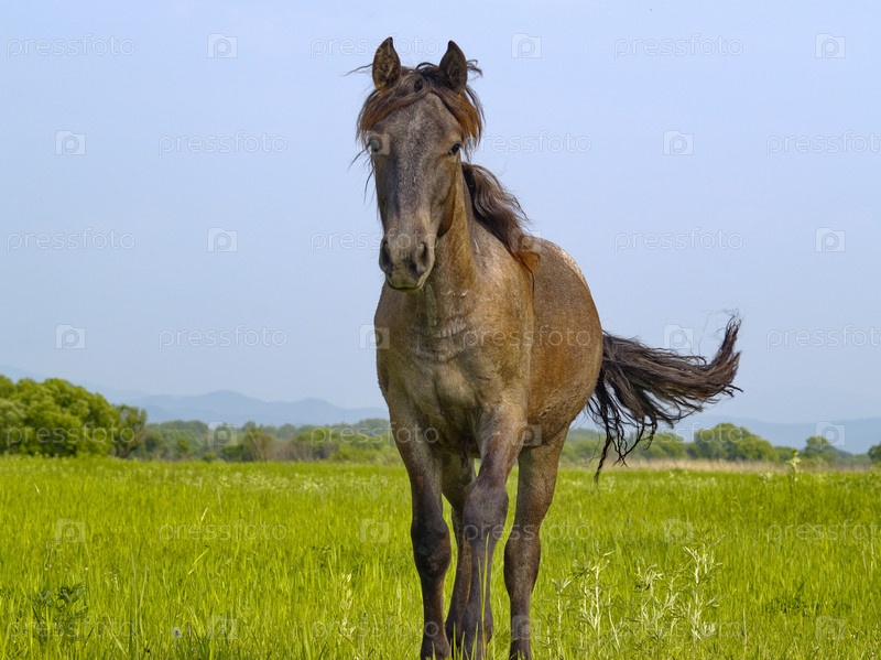 Лошадь на зеленом лугу