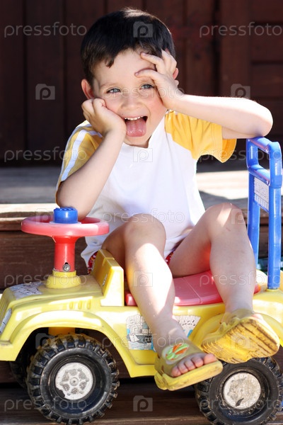 Мальчик сидит на игрушечной машинке