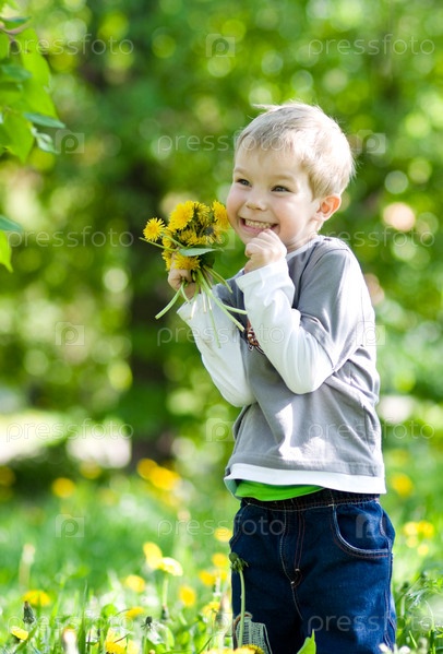 Маленький ребенок с букетом одуванчиков в летнем парке
