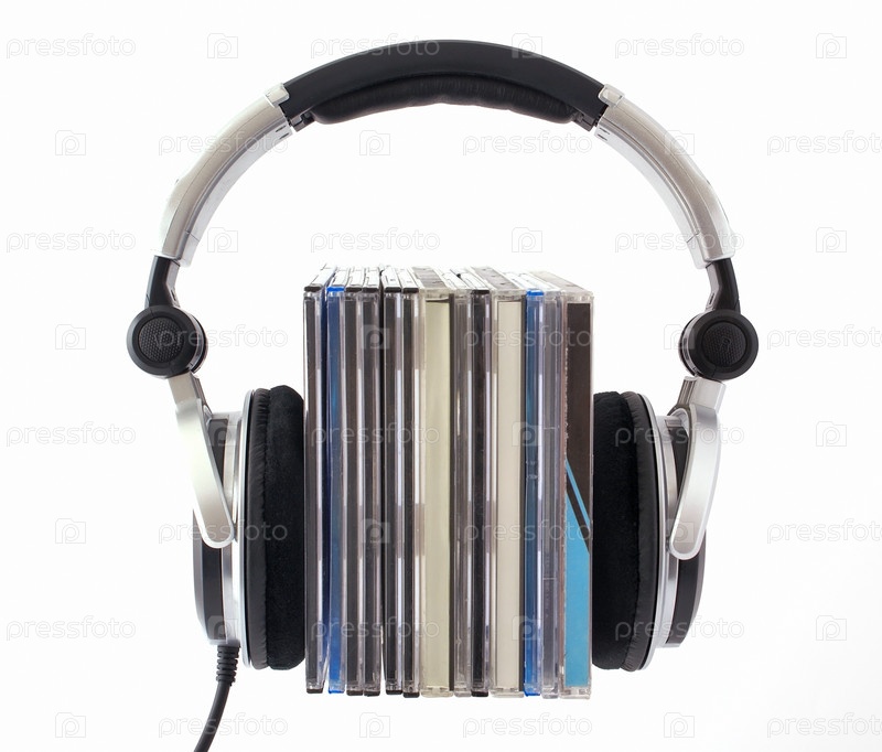 Наушники надеты на стопку лазерных дисков в коробках