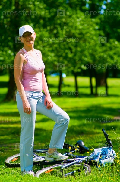 Молодая женщина с велосипедом в парке