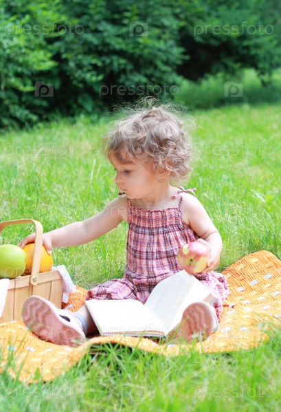 Маленькая девочка с книгой на пикнике в парке