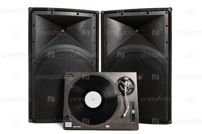 Виниловый проигрыватель и два мощных динамика на белом фоне