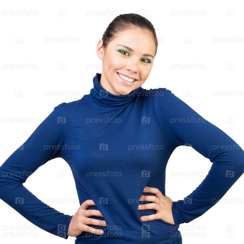 Красивая девушка с ярким макияжем улыбается и держит руки на поясе, на белом фоне