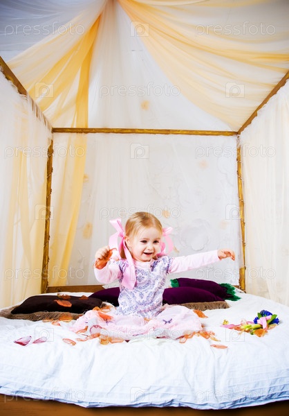 Красивая маленькая девочка играет с лепестками