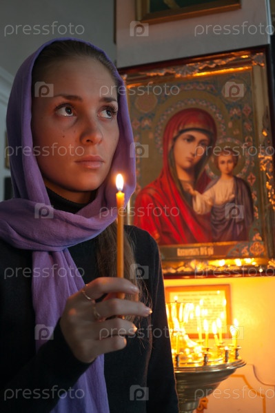 Девушка со свечой в православном храме