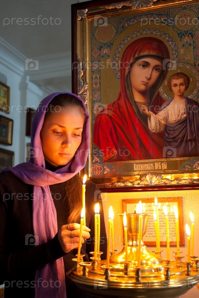 Девушка ставит свечку в православном храме