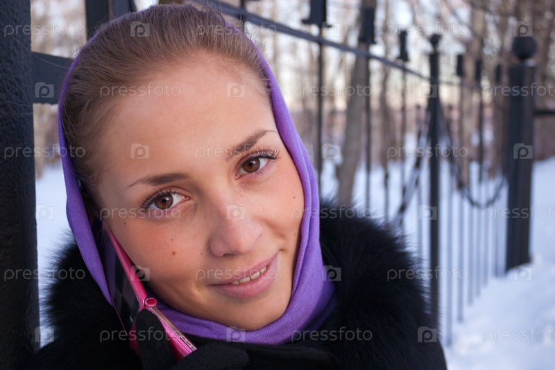 Девушка с розовым мобильным телефоном на улице зимой